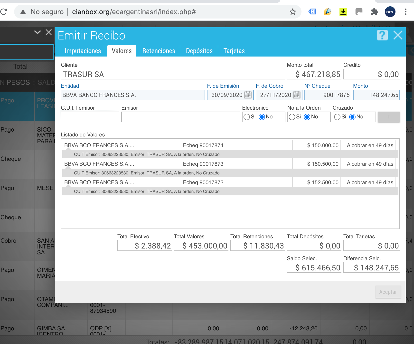Sería muy util poder tildar en la pantalla de Caja - Recibos - Carga de valores una opción que permita seleccionar que los cheques a ingresar son del mismo cliente, para de esta manera evitar tener que cargar el Nro. de CUIT en cada uno de los cheques que se ingresan.